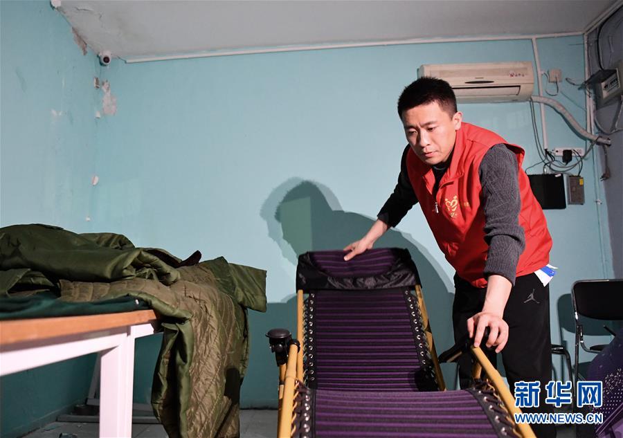 杨龙明在小区内的值班室整理躺椅,到后半夜的时候只能在这里稍微休息一下(6月1日摄)。新华社记者李然摄。