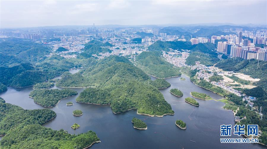 6月2日拍摄的贵阳市阿哈湖国家湿地公园(无人机照片)。初夏时节,贵州省贵阳市阿哈湖国家湿地公园草木苍翠,风景如画,吸引人们前来休闲游玩。新华社记者陶亮摄。