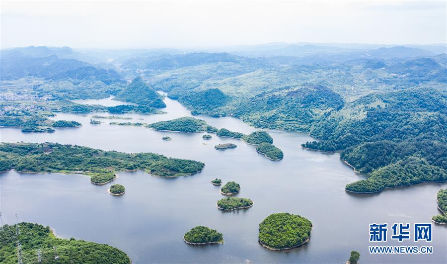 6月2日拍摄的贵阳市阿哈湖国家湿地公园(无人机照片)。初夏时节,贵州省贵阳市阿哈湖国家湿地公园草木苍翠,风景如画,吸引人们前来休闲游玩。新华社记者陶亮摄。