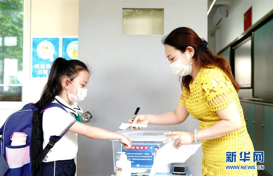 6月2日,上海闵行区鑫都小学,老师为一名一年级小学生量体温。当日,上海小学一、二、三年级学生返校开学。新华社记者张建松摄。