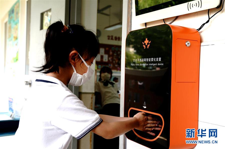 6月2日,上海闵行区鑫都小学,一名小学生使用手部消毒智能雾化装置。当日,上海小学一、二、三年级学生返校开学。新华社记者张建松摄。