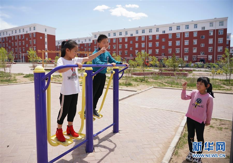 6月2日,儿童在尚义县大青沟镇的易地扶贫搬迁集中安置小区的广场玩耍。新华社记者杨世尧摄。