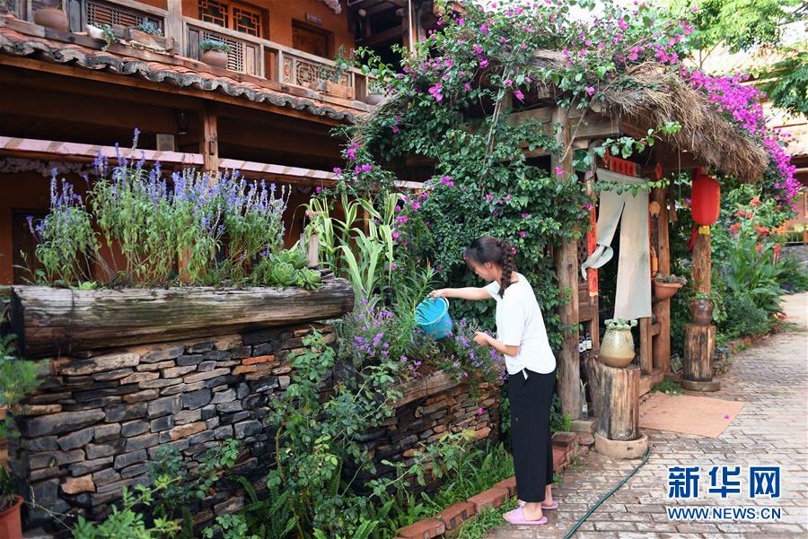 6月2日,云南丘北县普者黑仙人洞村的一名女孩在自家客栈浇花。新华社记者杨宗友摄。