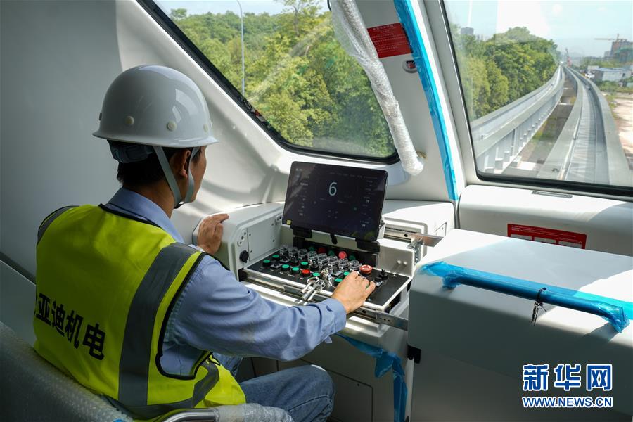 6月3日,工程技术人员在“云巴”车厢内对自动驾驶系统进行调试。近日,重庆市首条“云巴”示范线项目在重庆璧山区正式亮相。此次发布的“云巴”采用电能驱动,具有转弯半径小、爬坡能力强、噪音低、安全性高、建设成本低、建造周期短等优势,能为乘客提供更智能、舒适、便捷的出行体验。据介绍,璧山区“云巴”示范线项目自2019年8月开建,线路正线全长15.4km,共设车站15座,预计2020年9月全线通车。新华社记者刘潺摄。