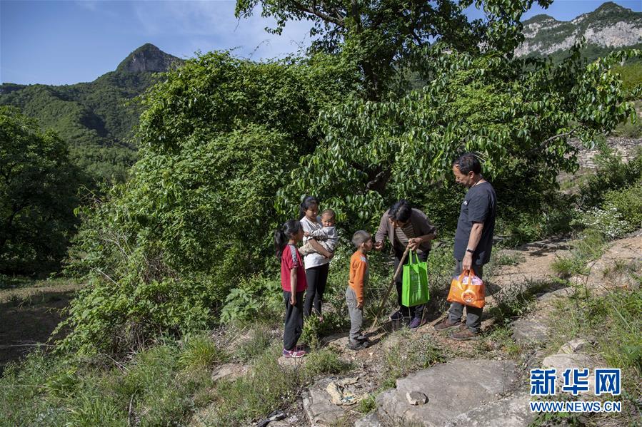 在南背村,秦春兰(右二)、秦秋兰(右三)和秦兴旺(左三)和老师们走在回家的山路上(5月31日摄)。新华社记者杨晨光摄。