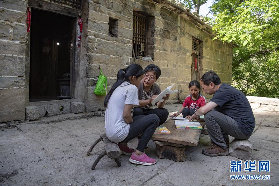 马武寨寄宿制小学语文老师崔连瑞(左二)和校长赵金成在南背村三姐弟的家里为孩子们辅导功课(5月31日摄)。新华社记者杨晨光摄。