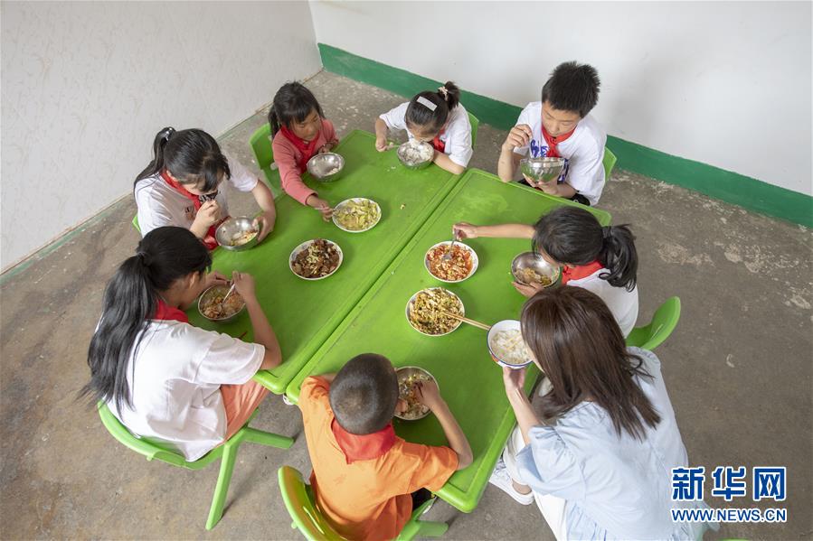 6月2日,马武寨寄宿制小学的学生们和老师在食堂内吃饭。新华社记者杨晨光摄。