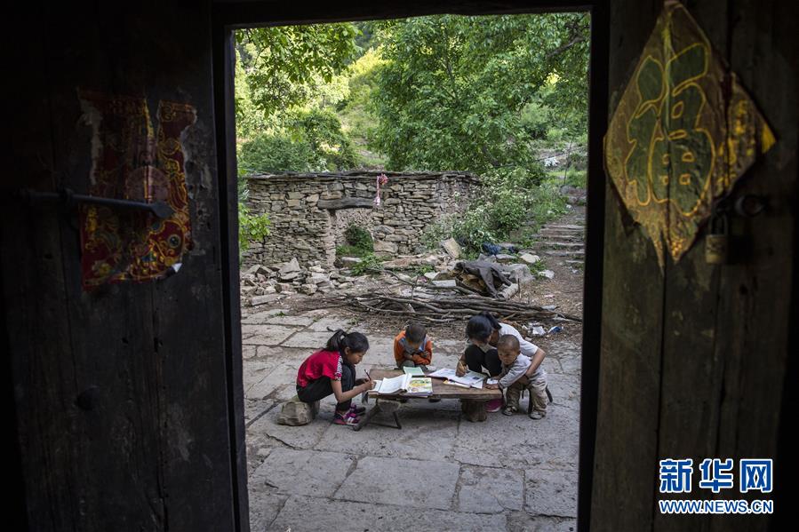 秦春兰(右二)、秦秋兰(左一)和秦兴旺(左二)在南背村的家里学习(5月31日摄)。新华社记者杨晨光摄。