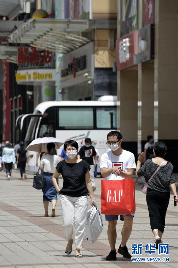 6月3日,市民及游客在王府井步行街购物。近日,游人和市民纷纷来到北京市的王府井、西单、前门大街等著名商业街购物休闲,这些老商业街开始逐步恢复昔日的繁华。新华社记者李欣摄。