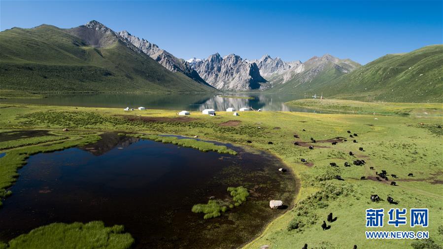 2019年7月8日拍摄的位于三江源地区的青海省果洛藏族自治州久治县境内的年保玉则风光(无人机照片)。6月2日,青海省生态环境厅发布《2019年青海省生态环境状况公报》称,青海省三江源地区境内的长江、黄河、澜沧江干流流域水质优良,植被覆盖度呈增长趋势,全省生态环境状况总体保持稳定。新华社记者吴刚摄。