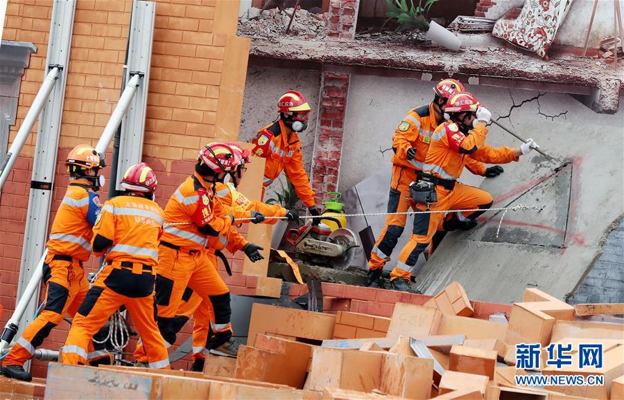 6月3日,救援人员在演练中对倒塌墙体进行破拆。新华社记者方喆摄。