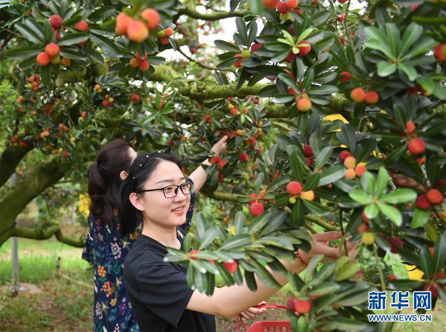 6月3日,游客在上虞区驿亭镇真山杨梅基地采摘。近日,浙江绍兴上虞区二都杨梅开采。杨梅是上虞区传统特色农产品,目前上虞区二都杨梅种植面积1651公顷,年产量1.1万吨,2019年二都杨梅成功申报国家农产品地理标志认证。新华社记者翁忻旸摄。