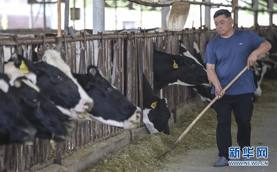 6月3日,村民在深州市榆科镇郝家庄村奶牛养殖扶贫基地饲喂奶牛。今年以来,河北省深州市围绕决胜全面小康、决战脱贫攻坚任务目标,在推进产业扶贫的过程中注重激发内生动力,通过电商扶贫、扶贫车间、特色种植养殖等多种形式,提升自我“造血”功能,提高贫困群众受益度。新华社记者李晓果摄。