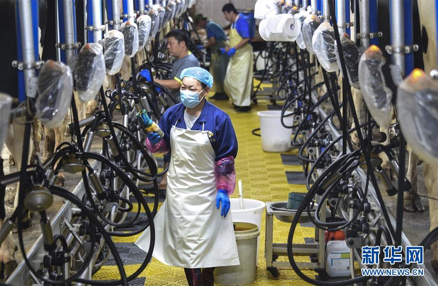 6月3日,村民在深州市榆科镇郝家庄村奶牛养殖扶贫基地查看挤奶设备运行情况。今年以来,河北省深州市围绕决胜全面小康、决战脱贫攻坚任务目标,在推进产业扶贫的过程中注重激发内生动力,通过电商扶贫、扶贫车间、特色种植养殖等多种形式,提升自我“造血”功能,提高贫困群众受益度。新华社记者李晓果摄。