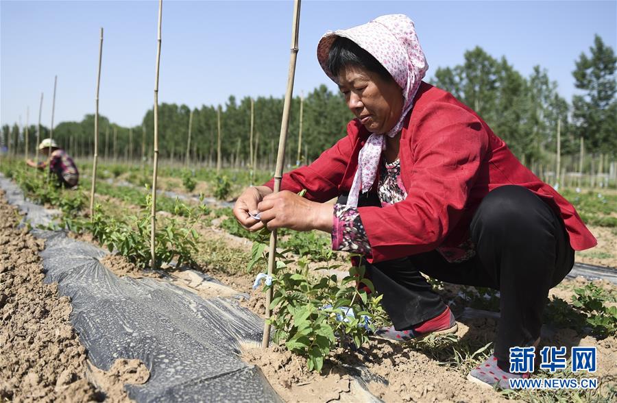 6月3日,村民在深州市魏家桥镇金银花种植扶贫基地管理金银花树。今年以来,河北省深州市围绕决胜全面小康、决战脱贫攻坚任务目标,在推进产业扶贫的过程中注重激发内生动力,通过电商扶贫、扶贫车间、特色种植养殖等多种形式,提升自我“造血”功能,提高贫困群众受益度。新华社记者李晓果摄。