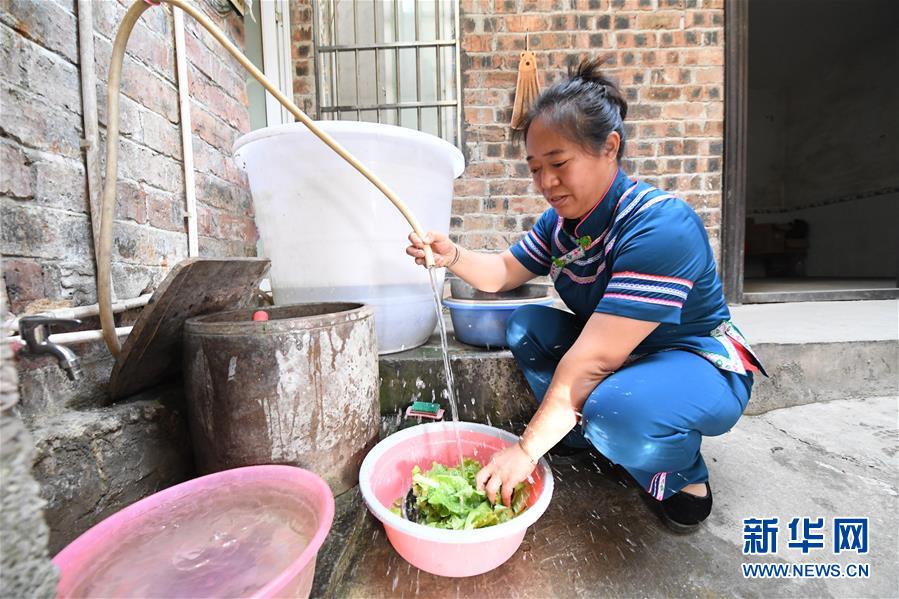 在广西环江毛南族自治县下南乡下南社区松朗屯,覃凤增在用自来水洗菜(5月22日摄)。新华社记者陆波岸摄。