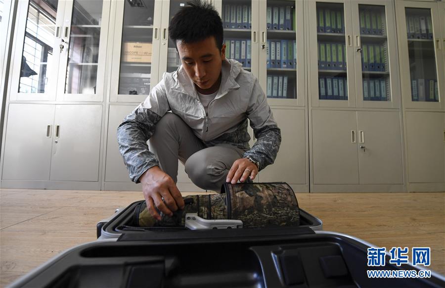 6月3日,李学明在整理设备,准备开始当天的巡护监测工作。新华社记者冯开华摄。