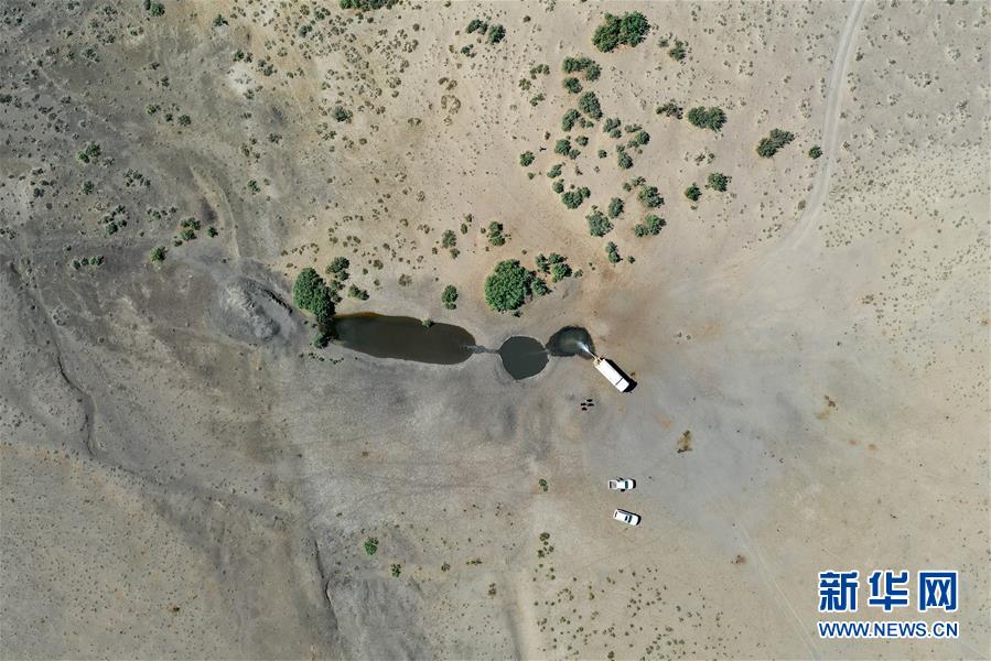 在新疆卡拉麦里山有蹄类野生动物自然保护区,管护员为水源地灌水(6月3日摄,无人机照片)。新华社记者丁磊摄。