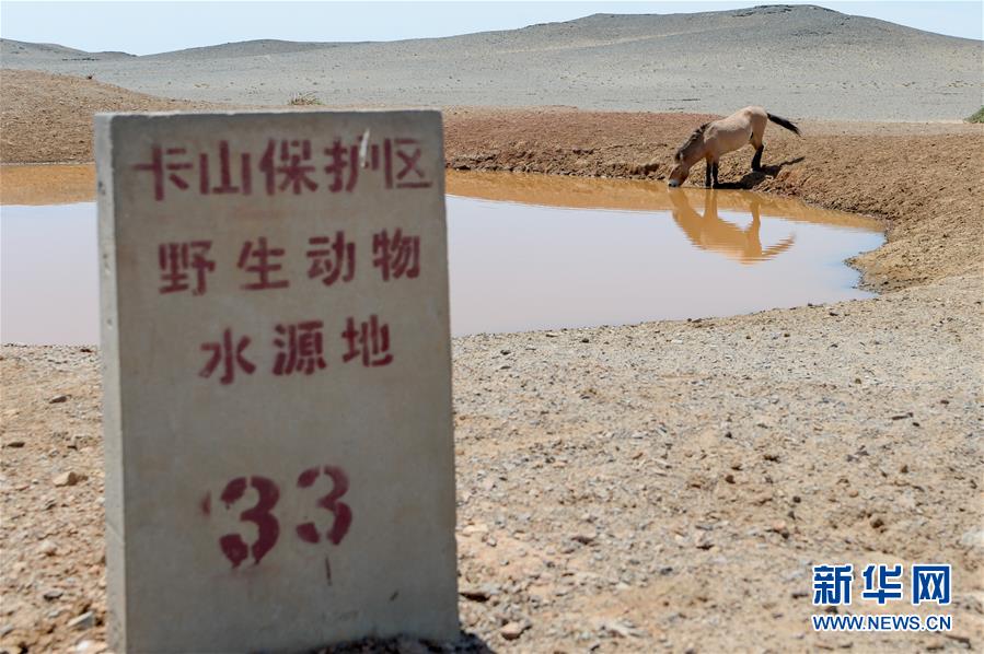 在新疆卡拉麦里山有蹄类野生动物自然保护区,一匹普氏野马来到33号水源地饮水(6月3日摄)。新华社记者丁磊摄。