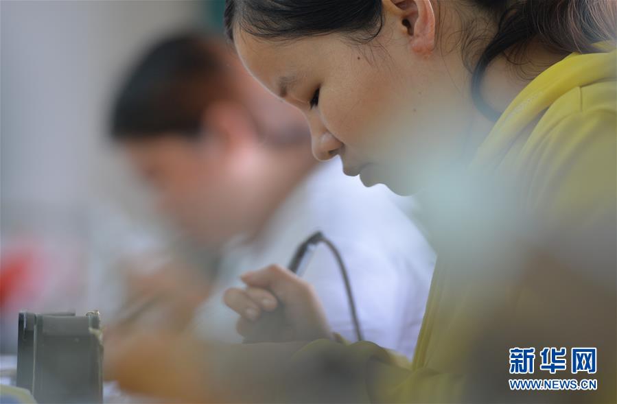 6月4日,工人在永州市新田县一处易地搬迁集中安置点的扶贫车间里加工电器零部件。新华社记者赵众志摄。