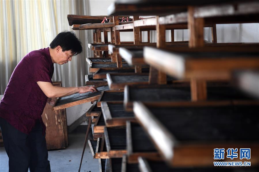 5月20日,安徽省非物质文化遗产徽墨代表性传承人项德胜在查看通风晾制的墨。新华社记者刘军喜摄。