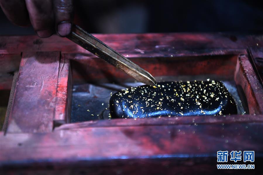5月21日,安徽歙县“项氏徽墨”的工人在墨胚上洒金。新华社记者张端摄。