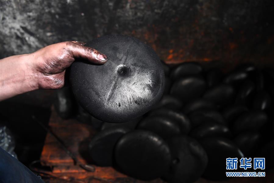 5月21日,安徽歙县“项氏徽墨”的工人在查看墨饼。墨饼经过加热融化,再进行捶打,制作成墨胚。新华社记者张端摄。