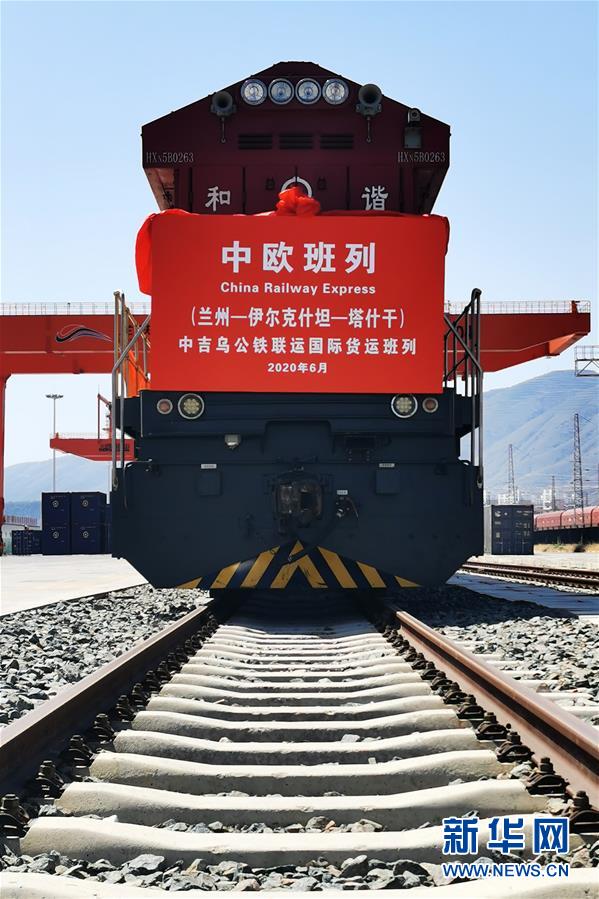 这是6月5日在甘肃兰州国际陆港拍摄的准备发车的“中吉乌”公铁联运国际货运班列。新华社记者范培珅摄。