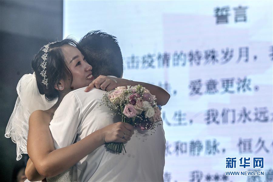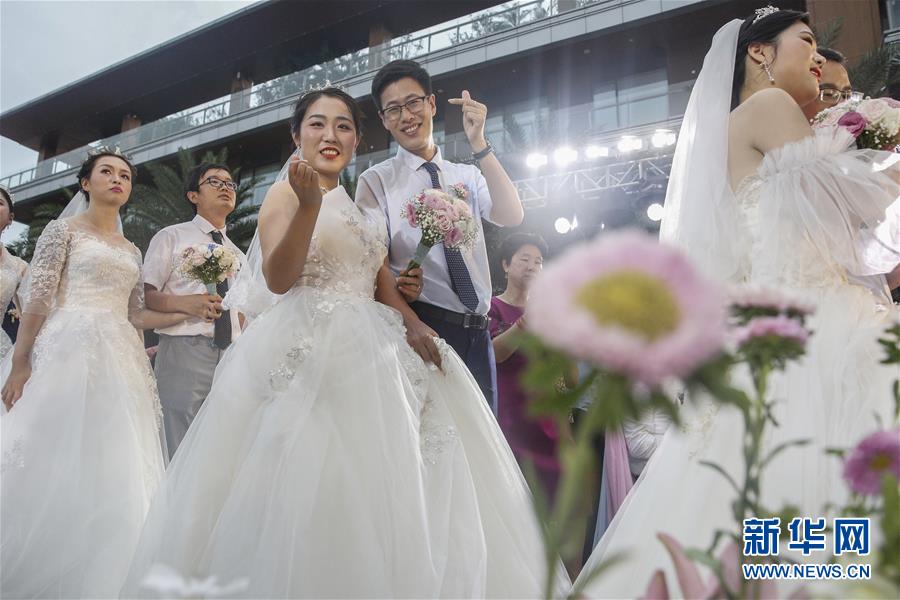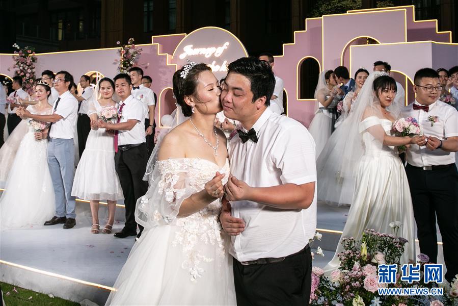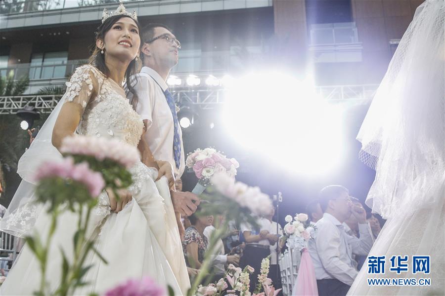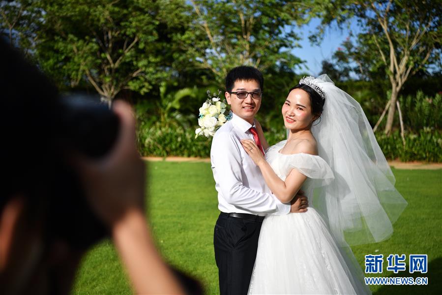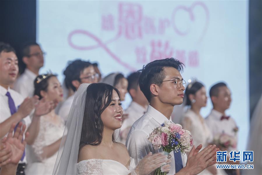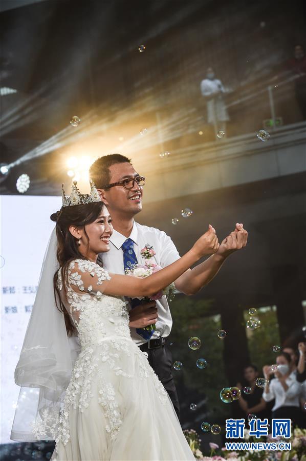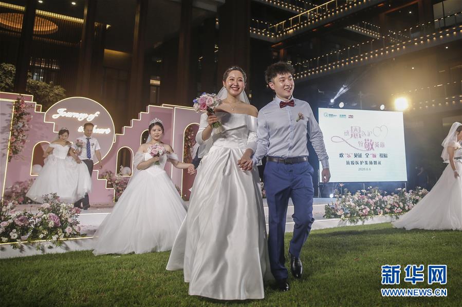 6月6日,新人在海南博鳌乐城国际医疗旅游先行区参加集体婚礼。当日,来自北京、武汉、广州等地的30对新人在海南博鳌乐城国际医疗旅游先行区参加了一场集体婚礼。参加婚礼的部分新人此前因参加湖北的抗疫工作而推迟了婚期。 新华社记者 张丽芸 摄