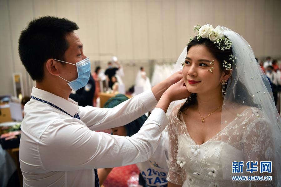 6月6日,曾支援湖北黄冈大别山区域医疗中心的湖南省人民医院急诊科护师陈建明为同为医务人员的妻子唐婵佩戴耳环。 当日,来自全国15个省份的百对新人在三亚市亚特兰蒂斯度假区举行了一场特殊的集体婚礼,每对新人中至少有一位参与过抗击新冠肺炎疫情的工作。 新华社记者 郭程 摄