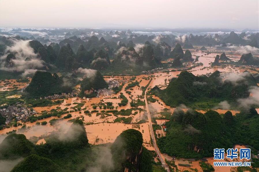 这是广西阳朔县部分出现严重积水的村庄(6月7日摄,无人机照片)。