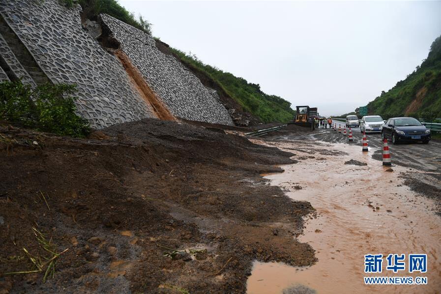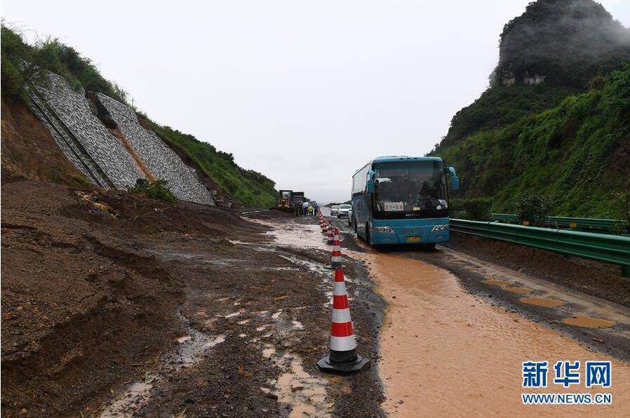 6月7日,在广西鹿寨至阳朔的高速公路上,车辆从一处发生滑坡的路段经过。新华社记者陆波岸摄