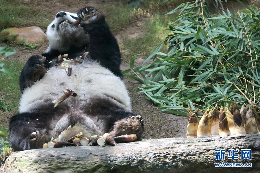 在香港海洋公园,大熊猫“安安”在躺着吃美食(5月11日摄)。新华社记者吴晓初摄