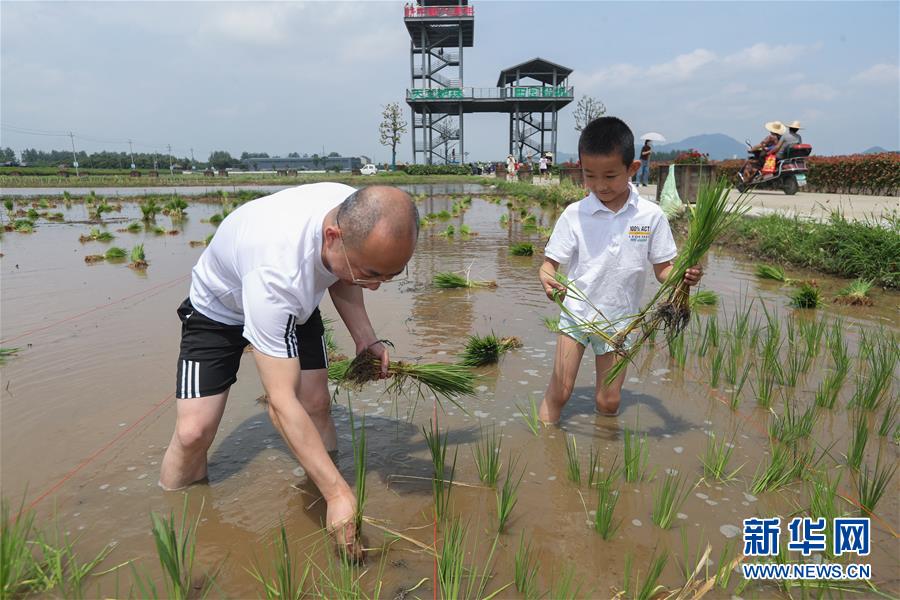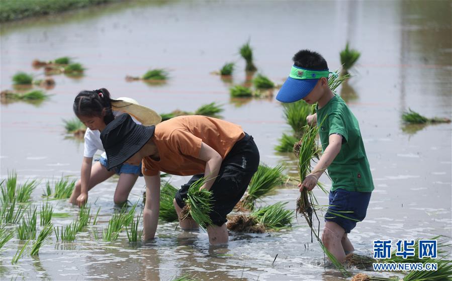 6月7日,孩子和家长体验稻田插秧。新华社记者徐昱摄