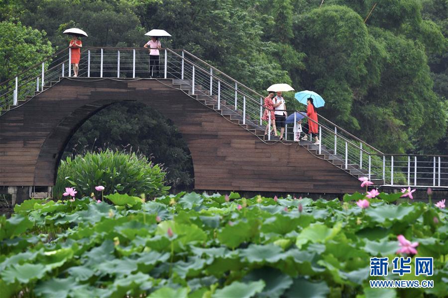 6月7日,一阵小雨过后,福州金山公园内盛开的荷花愈加娇艳欲滴,吸引市民前来游览。新华社记者姜克红摄