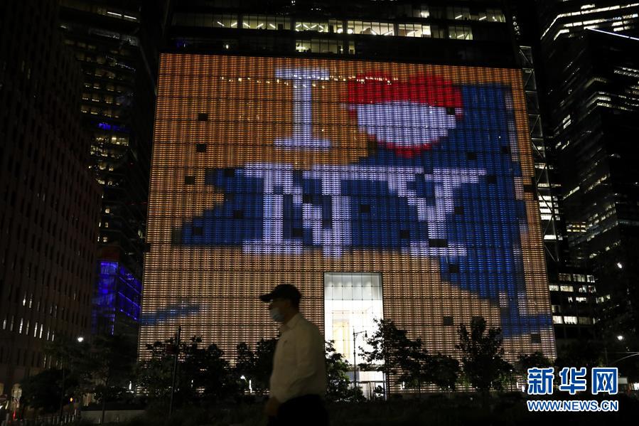6月7日,美国纽约世贸中心一号楼外墙呈现出“我爱纽约”字样。当日,纽约州多处建筑点亮蓝色和金色灯光,及用灯光效果呈现出“纽约坚强”、“我爱纽约”等字样,致敬纽约民众团结抗击疫情。新华社记者王迎摄