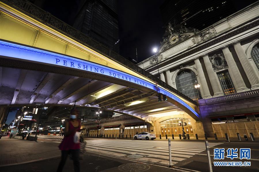 6月7日,美国纽约中央车站天桥点亮蓝色和金色灯光。新华社记者王迎摄