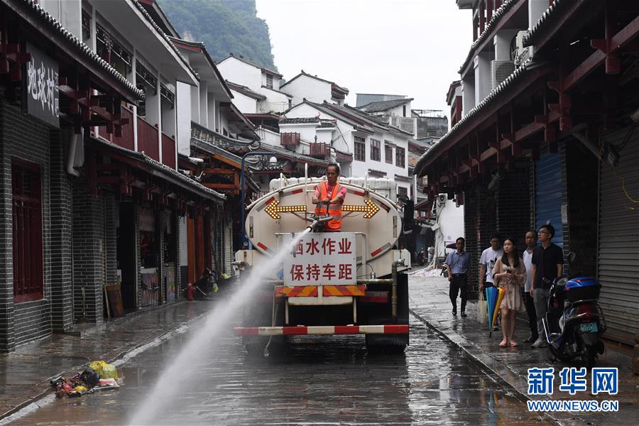 6月8日,在广西阳朔县西街,环卫工人在冲洗被洪水浸泡的街道。6月6日至8日,广西阳朔县普降暴雨,局部降特大暴雨,全县9个乡镇出现洪涝灾害。目前,全县正有序开展灾后生产生活恢复。新华社记者陆波岸摄