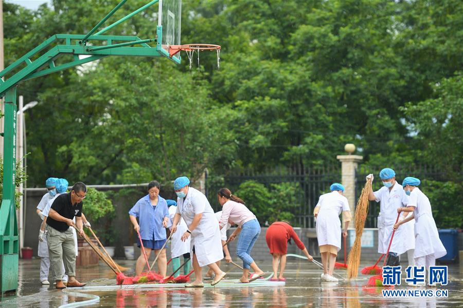 6月8日,在永州市江华瑶族自治县白芒营镇车下完全小学,工作人员在校园里清淤、冲洗地面。受近日持续强降雨影响,湖南省永州市江华瑶族自治县发生洪涝灾害。6月8日,永州市江华瑶族自治县白芒营镇车下完全小学开展清淤、消毒工作,为6月9日恢复上课做准备。新华社记者陈泽国摄