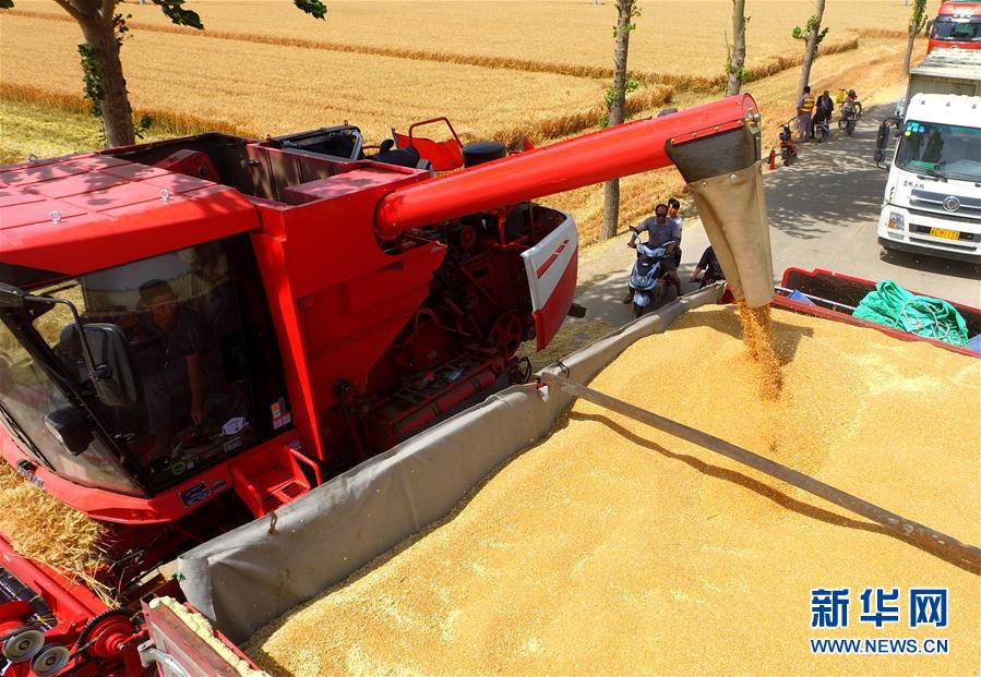 6月8日,在河北省南和县闫里乡闫里村,农民将收获的小麦装车(无人机照片)。“三夏”期间,河北省预计组织和调度小麦联合收割机、拖拉机、夏玉米播种机等200万台农业机械投入作业。新华社记者朱旭东摄