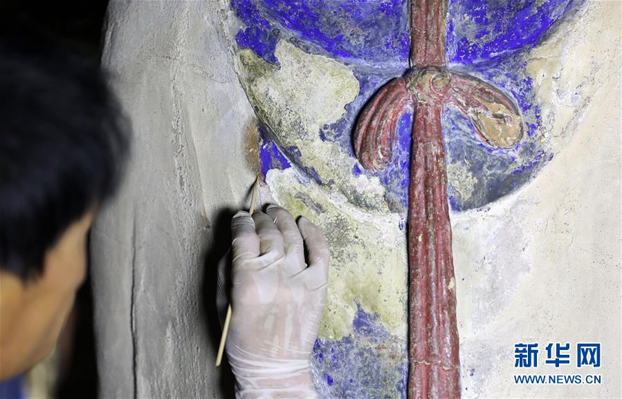 6月8日,工作人员对奉国寺的彩绘泥塑进行保护修复。新华社记者姚剑锋摄