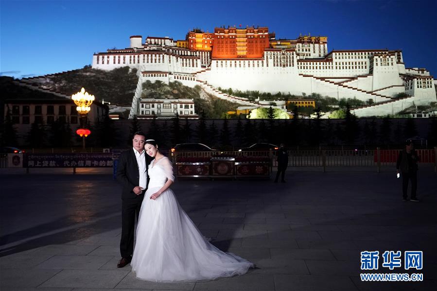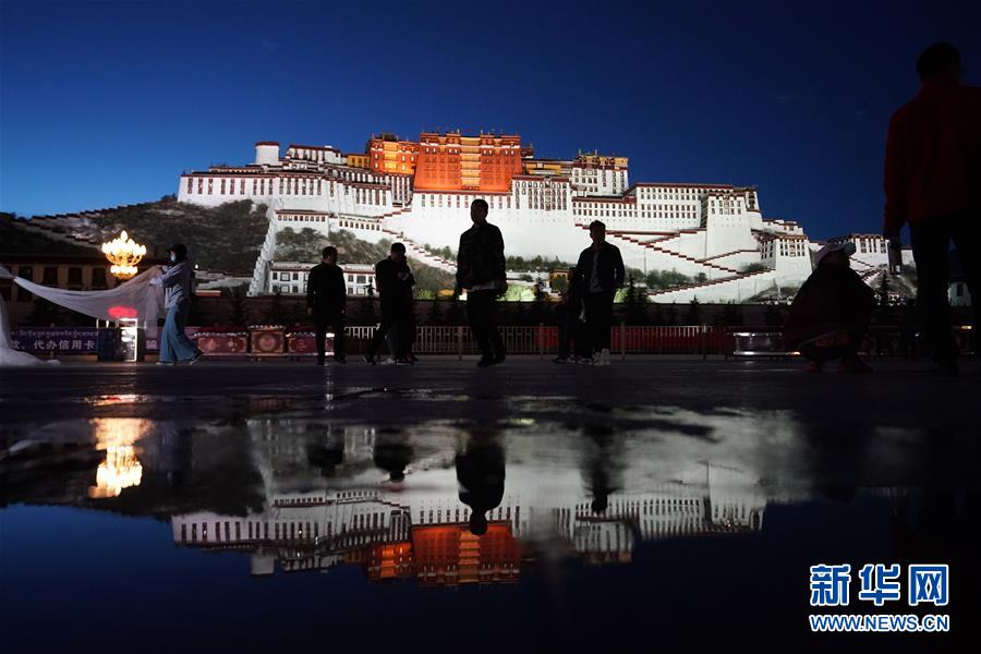 游客在布达拉宫广场拍照(6月8日摄)。夜幕降临,西藏拉萨布达拉宫灯光璀璨,夜景迷人。新华社记者詹彦摄