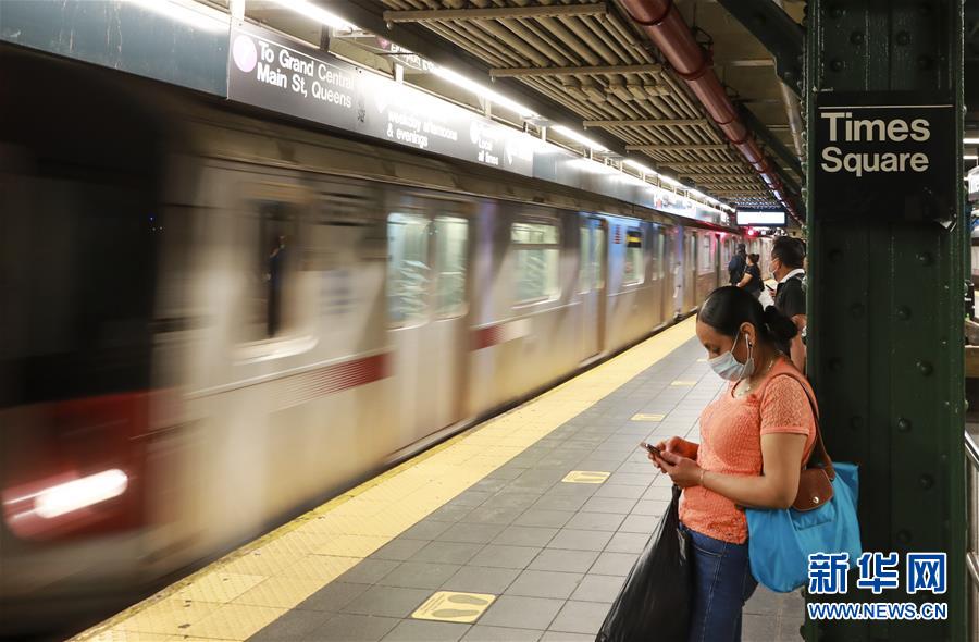 6月8日,佩戴口罩的乘客在美国纽约一地铁站内等车,地面上安置了保持社交距离的标记。在因新冠疫情进入“居家令”近三个月之后,美国纽约市于当地时间8日开始“解封”,进入经济重启的第一阶段。新华社记者王迎摄
