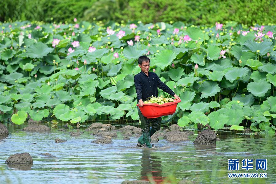 6月9日,村民在海口龙华区龙泉镇美仁坡村采摘莲蓬。初夏时节,位于海南海口龙华区龙泉镇的莲蓬逐渐成熟,当地村民加紧采摘,一派繁忙景象。新华社记者蒲晓旭摄