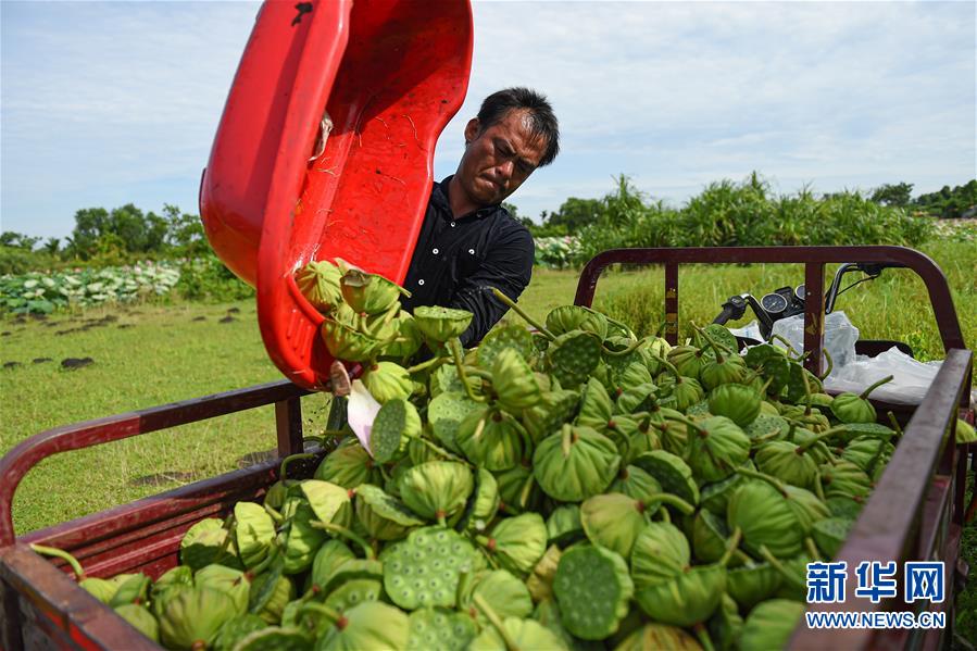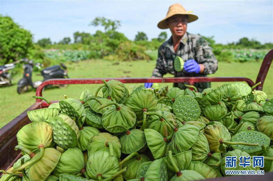 6月9日,村民在海口龙华区龙泉镇椰子头村装运采摘的莲蓬。初夏时节,位于海南海口龙华区龙泉镇的莲蓬逐渐成熟,当地村民加紧采摘,一派繁忙景象。新华社记者蒲晓旭摄