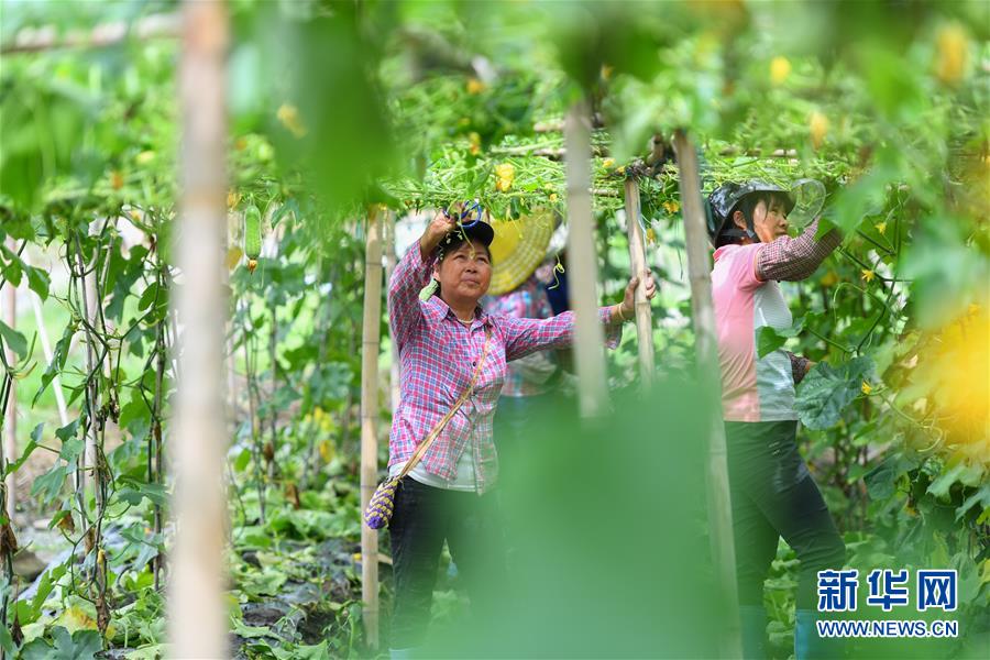 6月9日,在江华瑶族自治县涛圩镇凤尾村蔬菜基地,农户在修剪枝叶。近日,受连续强降雨影响,湖南省永州市江华瑶族自治县遭遇洪涝灾害,部分农田受灾。目前,江华瑶族自治县洪水已退,群众在当地相关部门引导下积极开展生产自救。新华社记者陈泽国摄