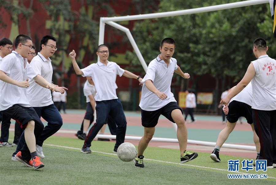 6月9日,河北省衡水市第二中学的高三学生在操场上踢足球。2020年高考临近,河北省衡水市第二中学组织开展多种形式的集体“减压”活动,帮助高三学生在紧张备考之余释放身心压力,以轻松、乐观、自信的心态迎接高考。新华社记者朱旭东摄