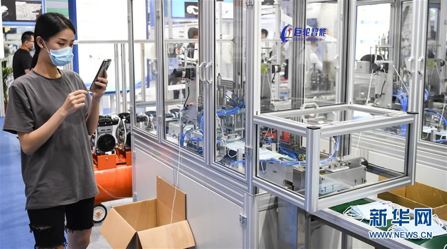 6月10日,观众拍摄展会上的一台口罩生产设备。当日,广州国际防疫物资展览会在保利世贸博览馆举行。本次展会面积共计3.6万平方米,设有防疫产品、设备、综合服务、原辅料等4个展区,参展企业约600家。新华社记者邓华摄