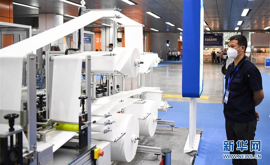6月10日拍摄的展会上的一台口罩生产设备。当日,广州国际防疫物资展览会在保利世贸博览馆举行。本次展会面积共计3.6万平方米,设有防疫产品、设备、综合服务、原辅料等4个展区,参展企业约600家。新华社记者邓华摄