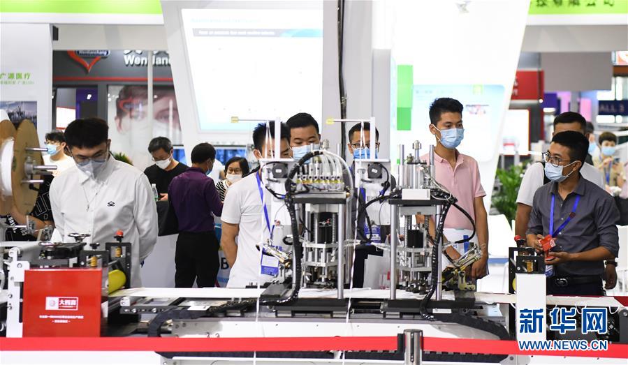 6月10日,观众参观展会上的一台口罩生产设备。当日,广州国际防疫物资展览会在保利世贸博览馆举行。本次展会面积共计3.6万平方米,设有防疫产品、设备、综合服务、原辅料等4个展区,参展企业约600家。新华社记者邓华摄